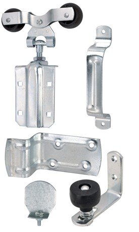 (1) heavy-duty door pull - 52-9081 ~ 1) stay roller - 51-9983 ~ (2) round track hanger - 57-9201 ~ (1) barn door bumper - 52-0817 ~ (2) rail end caps for track - 53-7043 ~ Includes bag of fasteners for assembly