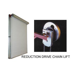 INDUSTRIAL ROLL UP DOOR Provide security without loss of space; totally self-contained dock doors have no overhead tracks or door sections allowing interference-free ceiling height use. Strong 26-gauge deep-ribbed corrugated galvanized steel door has primer and white siliconized polyester painted finish. Limited 20-year film integrity guarantee against chalking and fading. Door bottom has galvanized steel angle frame, pair of 10-gauge padlockable slide locks and replaceable vinyl weather seal. Door drum/torque tube assembly offers radial bearings to ensure smooth quiet operation. Reduction Drive Chain Lift offers 4:1 ratio for easiest operation, and integral chain lock to keep door in position and chain safely out of the way. Quick easy installation; includes all hardware for attaching to masonry and wood frames. For other sizes and colors, for attaching to steel buildings, and for security vision panels, call for pricing.